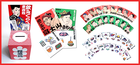 - 投票したお店の対決相手のお店に似顔絵ステッカーを持っていくと、おつまみステッカーがもらえます!